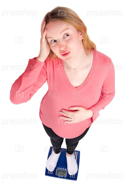 Беременная женщина стоит на весах на белом фоне