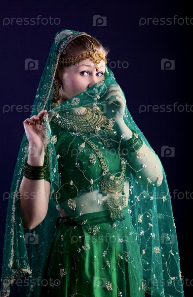 Красивая девушка в индийском костюме прикрывает лицо вуалью