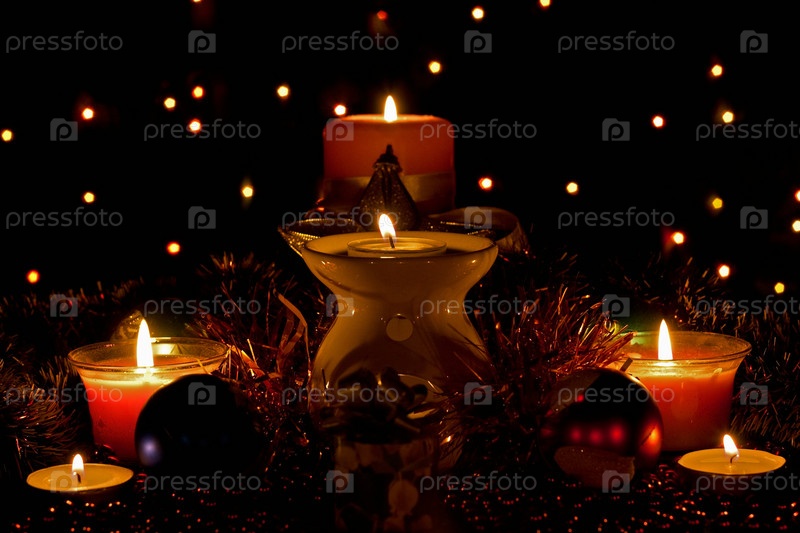 Новогодние свечи и гирлянды крупным планом