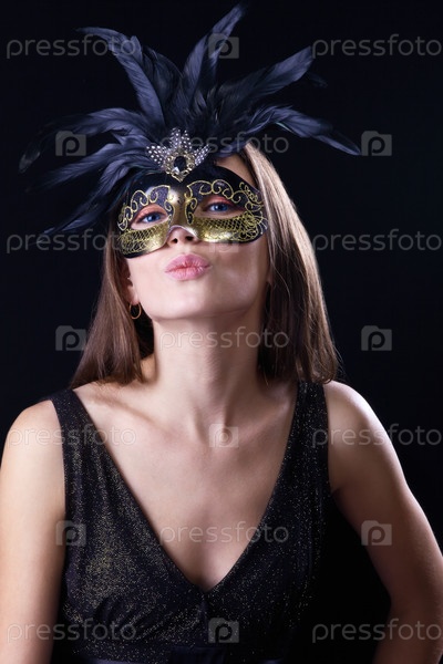 Женщина в маске с перьями, посылающая воздушный поцелуй