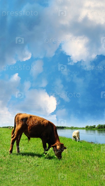 Две коровы на зеленом лугу на фоне реки и голубого неба с облаками