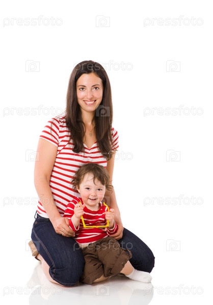 Мама с годовалой дочкой, изолированные на белом