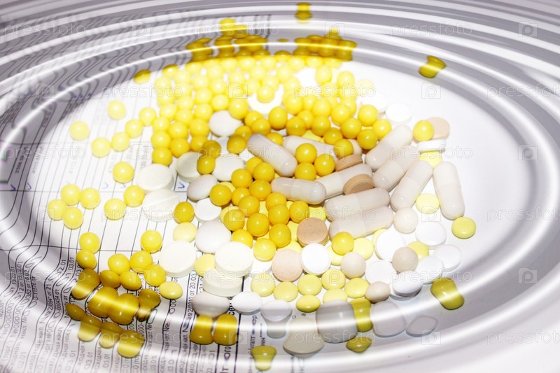 Абстракция с желтыми и белыми таблетками и витаминами на фоне белых волн