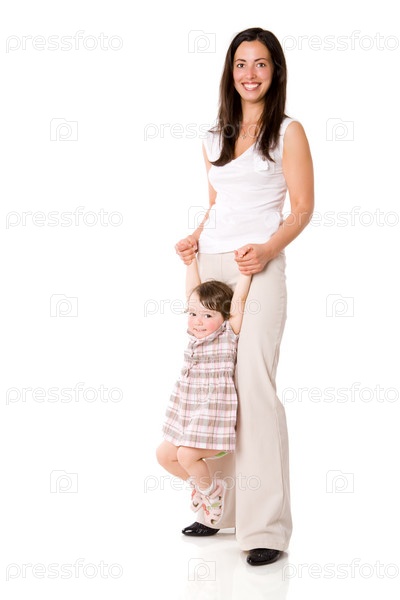 Улыбающиеся мама с дочкой, изолированные на белом
