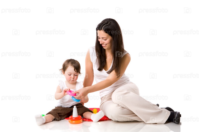 Мама собирает с дочкой пирамидку, изолированные на белом фоне
