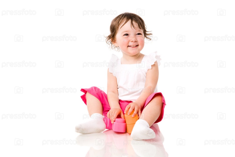 Счастливая девочка играет на полу, изолированная на белом