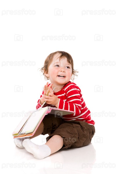Смеющаяся девочка с книгой, изолированная на белом
