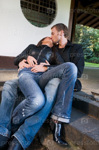 Молодая пара целуется, сидя на ступеньках