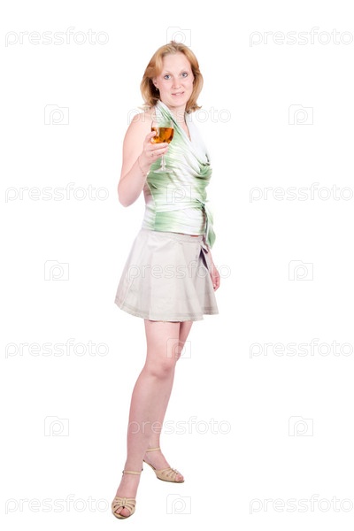 Молодая девушка с бокалом в руке на белом фоне