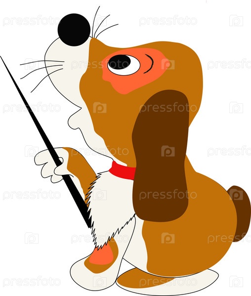 Коричневый песик с указкой на белом фоне