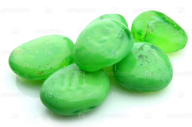 Зеленые стеклянные камушки на белом фоне