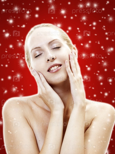 Красивая улыбающаяся женщина с идеальной кожей на красном фоне со снежинками. Уход за кожей в подарок на Рождество