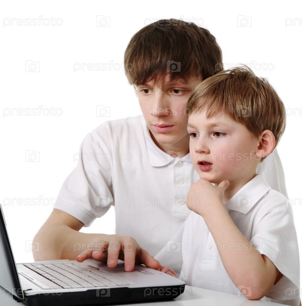 Два брата сидят за ноутбуком
