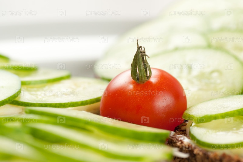 Маленький красный помидор среди ломтиков огурцов