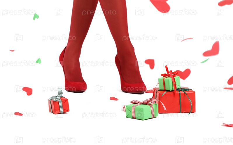 Женские ножки в красном и подарки на белом фоне