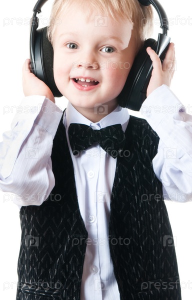 Маленький мальчик в наушниках на белом фоне