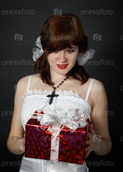 Красивая девушка с подарком на черном фоне