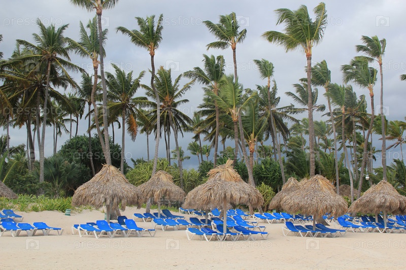 Пустынный пляж с лежаками
