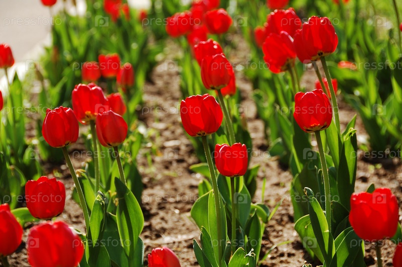 Красные тюльпаны на клумбе в ясный весенний день