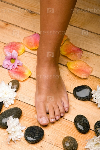 Красивая женская нога на деревянном полу с лепестками цветов и морской галькой