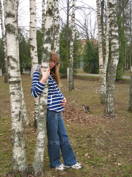 Молодая беременная девушка среди берез