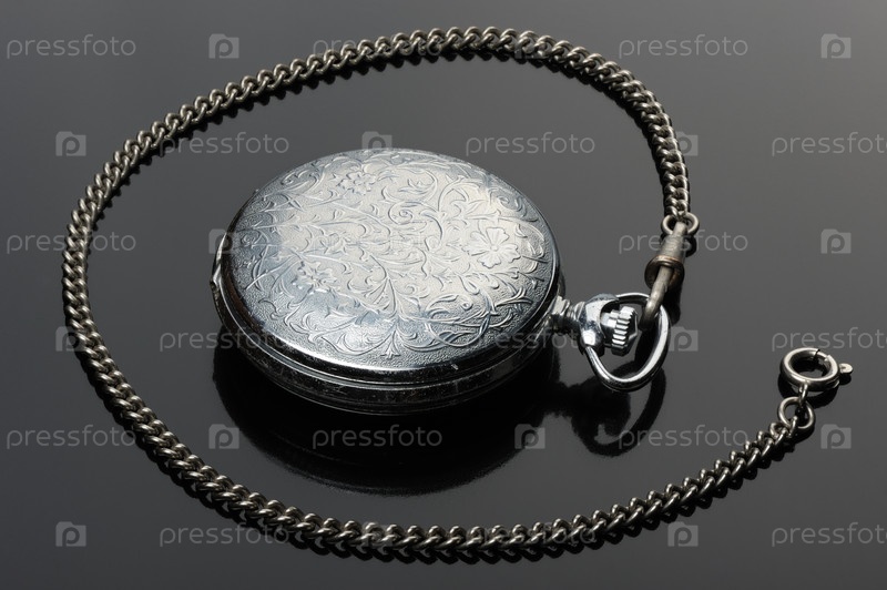 Карманные часы с закрытой крышкой и их отражение на черном фоне