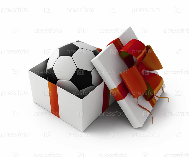 Футбольный мяч в подарочной коробке, изолированный на белом фоне