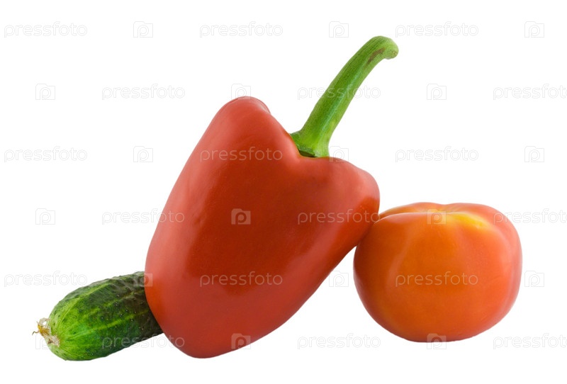 Огурец, перец и томат на белом фоне