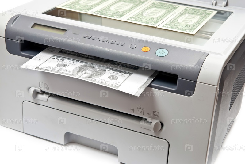 Серый лазерный принтер и доллары, изолированные на белом фоне