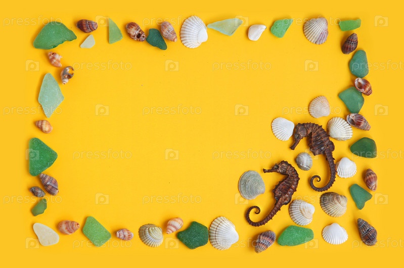 Рама из морских раковин и стеклянных камней на желтом фоне