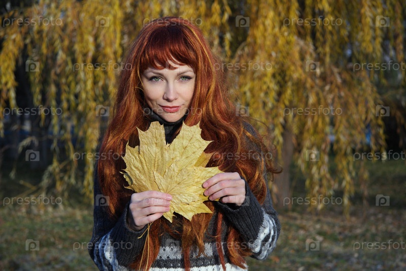 Рыжеволосая девушка с листьями клена