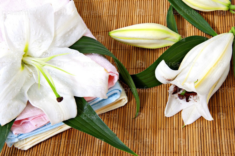 Белые лилии с зелеными листьями, лежащие на деревянном коврике