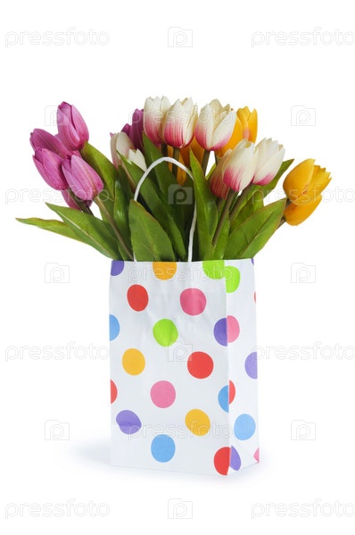 Тюльпаны в пакете на белом фоне