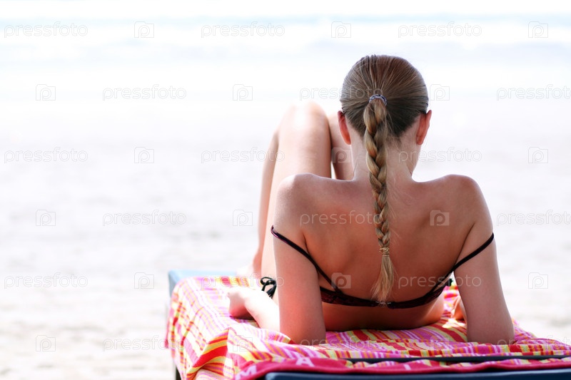 Девушка загорает на шезлонге