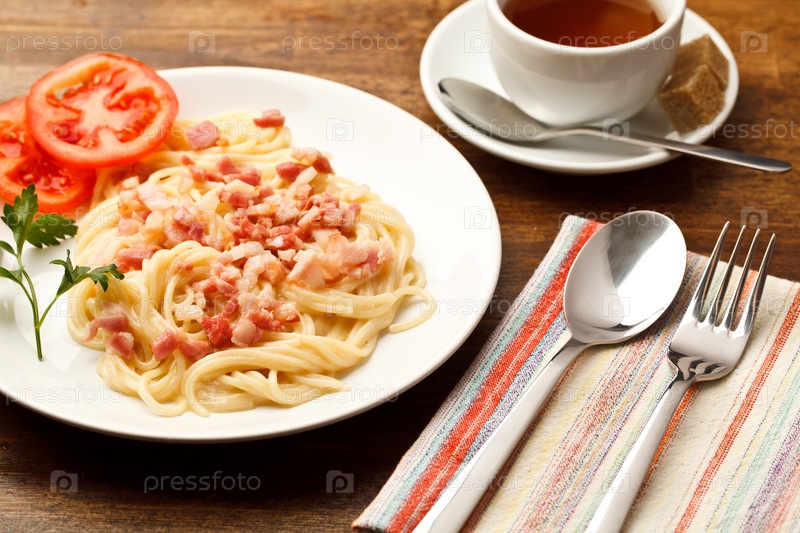 Порция спагетти с ветчиной и чай