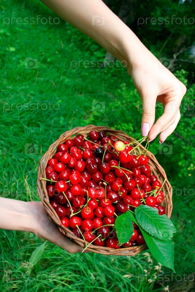 Женщина держит корзинку спелой вишни