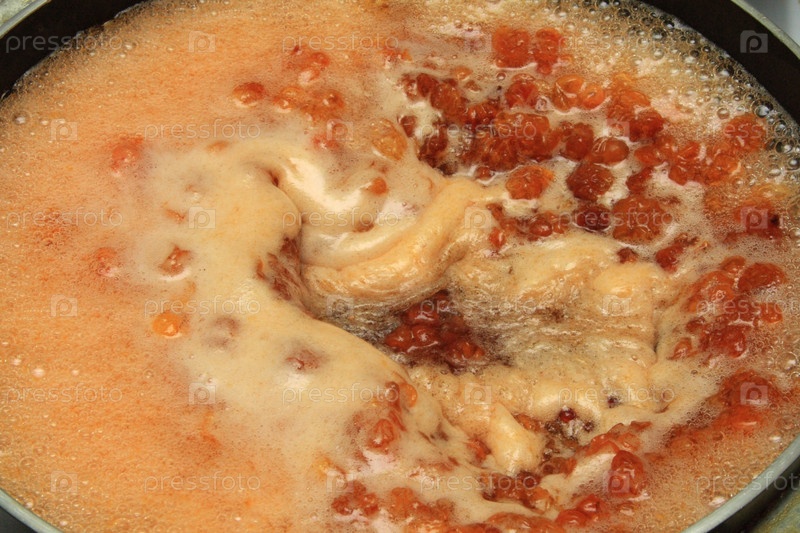 Полная сковородка кипящего варенья из спелых облачных ягод