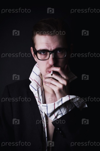 Мужчина в очках и с сигаретой на черном фоне