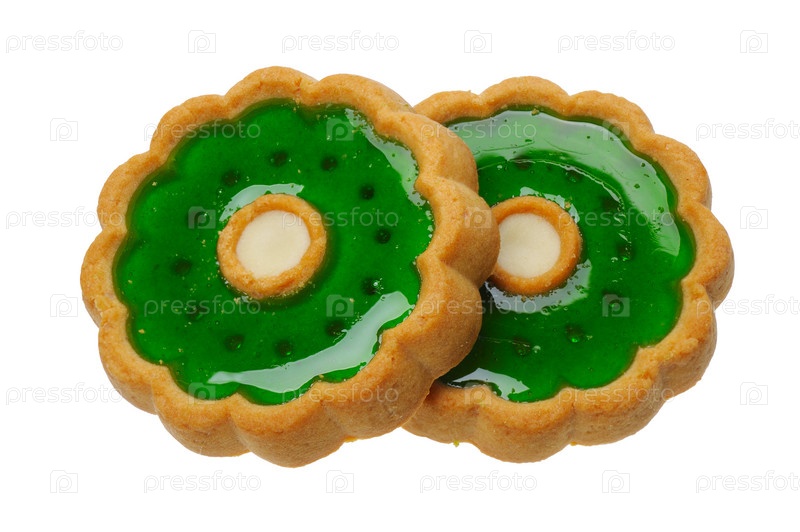 Сладкое песочное печенье с зеленым желе на белом фоне