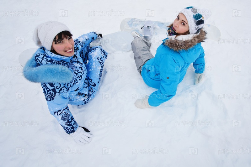 Девушки-сноубордисты на снегу