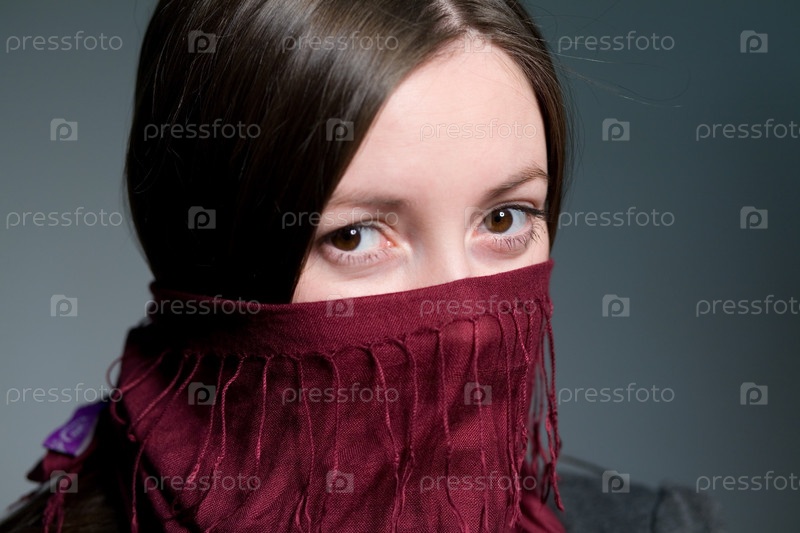 Портрет мусульманки с закрытым лицом на сером фоне