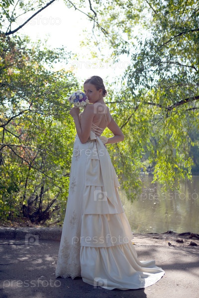 Невеста с букетом на берегу пруда в парке