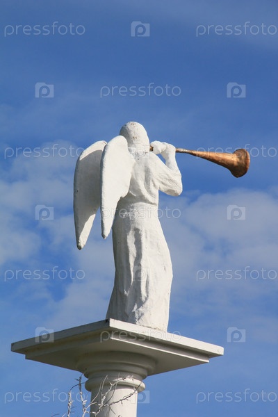 Белокаменная статуя ангела на фоне синего неба