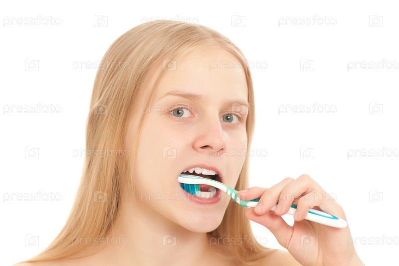 Молодая блондинка чистит зубы на белом фоне