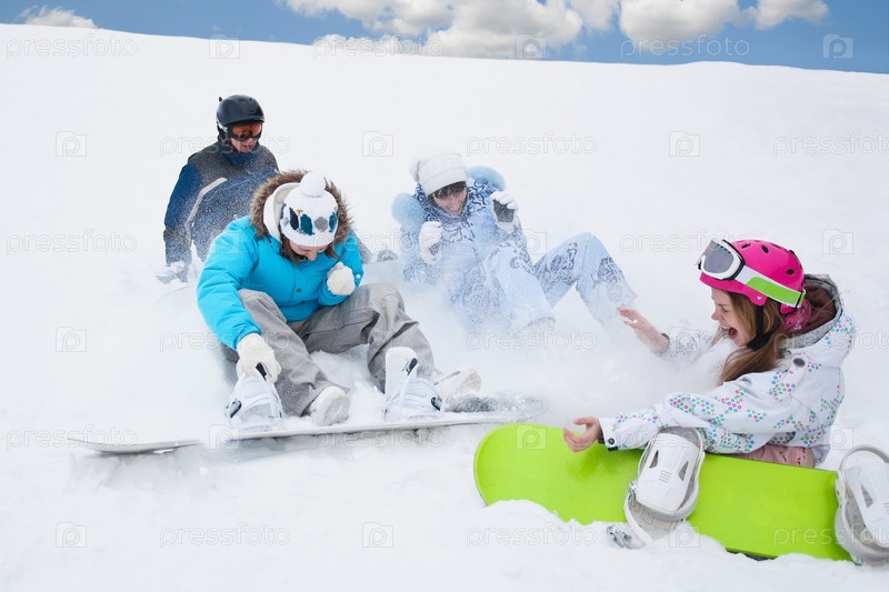Молодые люди катаются на сноубордах