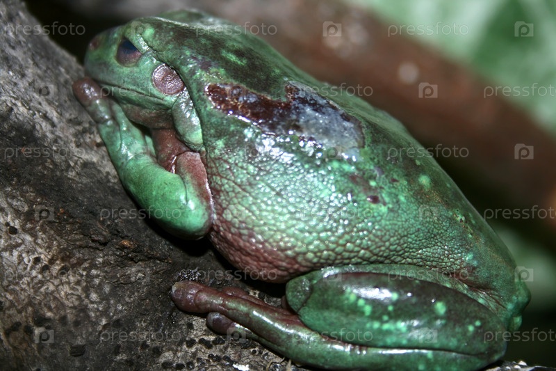 Красочная зеленая лягушка на ветке
