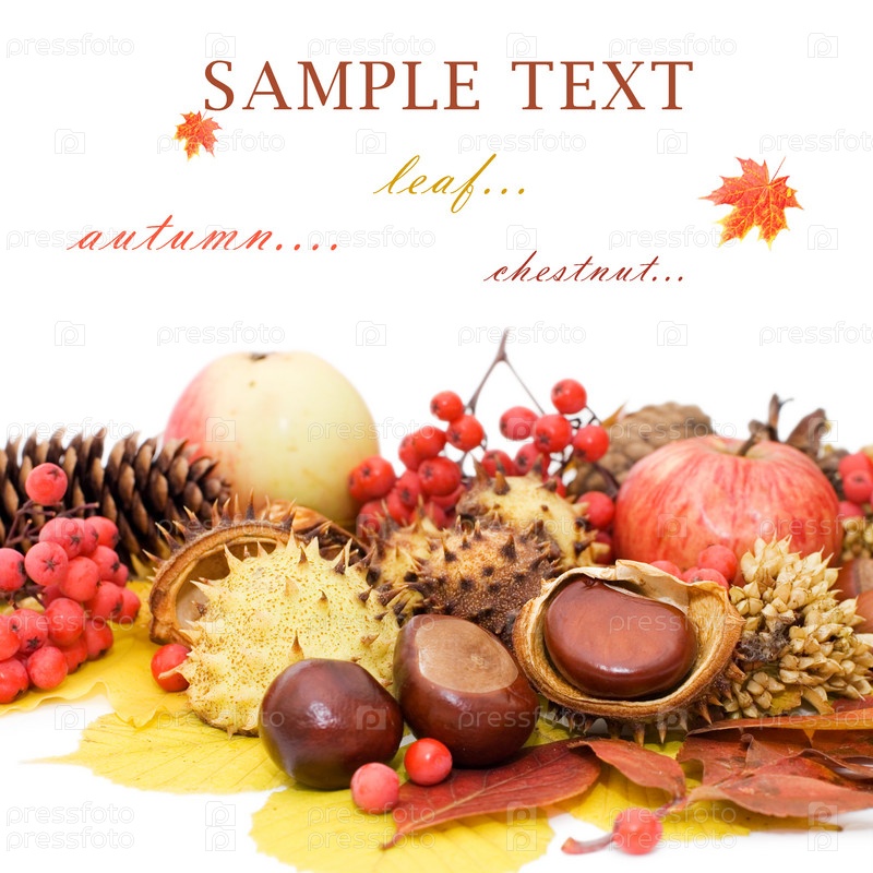 Осенние листья и плоды на белом фоне