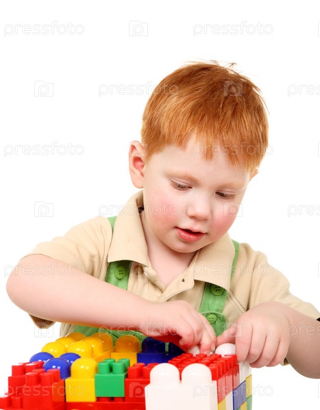 Маленький мальчик строит игрушечное сооружение, изолированный на белом фоне