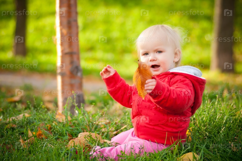 Маленький ребенок в красной курточке сидит на траве