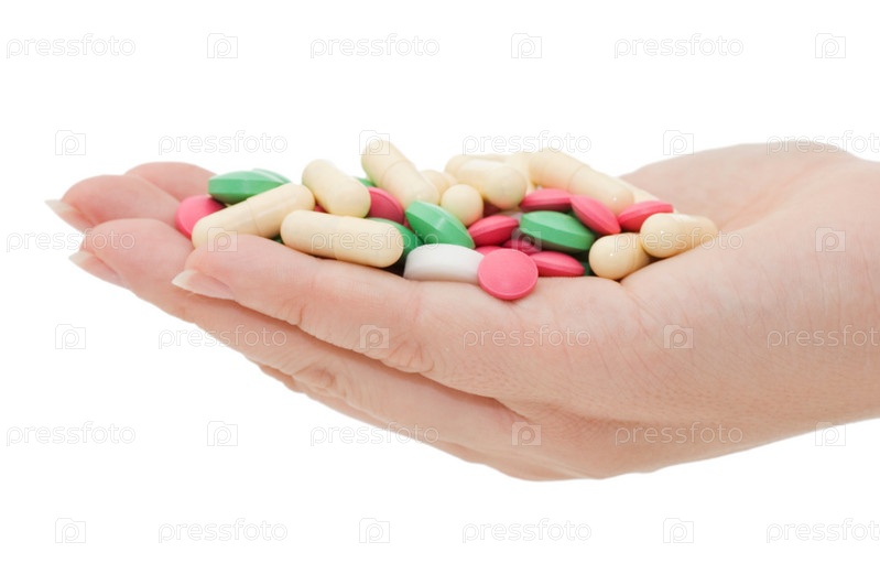 Человеческая ладонь, наполненная разными медицинскими препаратами